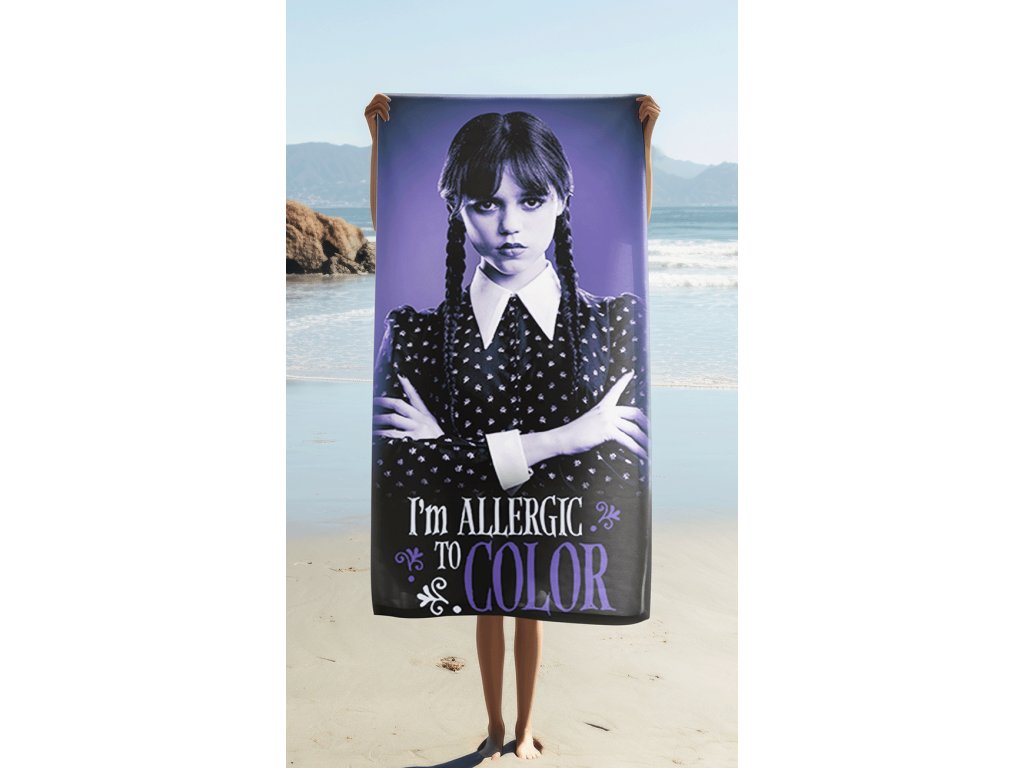 Spríjemnite svojim deťom cesty do kúpeľne. Na osuške je postava Wednesday Addamsovej z amerického komediálneho seriálu. Froté osuška o rozmere 70x140 cm je krásne mäkká, nadýchaná a dobre saje vodu. Osuška vyrobená zo 100% bavlny o gramáži 300 g/m2 je ocenená medzinárodným certifikátom zdravotnej nezávadnosti Oeko-Tex Standard. Predná strana osušky je z jemne strihaného froté, velúrová, veľmi príjemná na dotyk. Zadnú stranu osušky tvorí husto tkaná froté slučka bielej farby. Osušku môžete využiť v kúpeľni aj v lete na pláži.