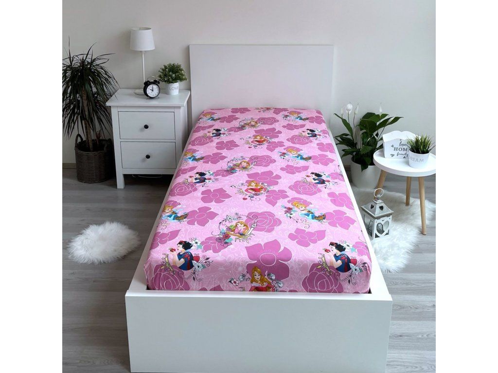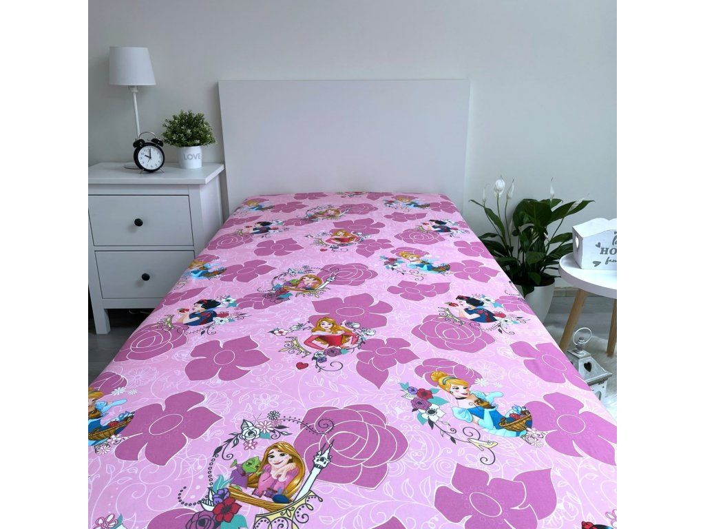 Licencované napínacie prestieradlo 90x200 cm s motívmi obľúbených princezien vás zaujme hladkým pocitom bavlneného plátna a žiarivými farbami. Rohy bavlneného prestieradla sú napnuté pomocou gumy v tuneli, vďaka čomu prestieradlo priľne k matracu bez zbytočných záhybov. Prestieradlo vytvára ideálnu klímu na pokojný a zdravý spánok. Prestieradlo s potlačou môžete skombinovať s prestieradlom s rovnakým motívom a vytvoriť tak dokonalú súpravu do detskej izby.