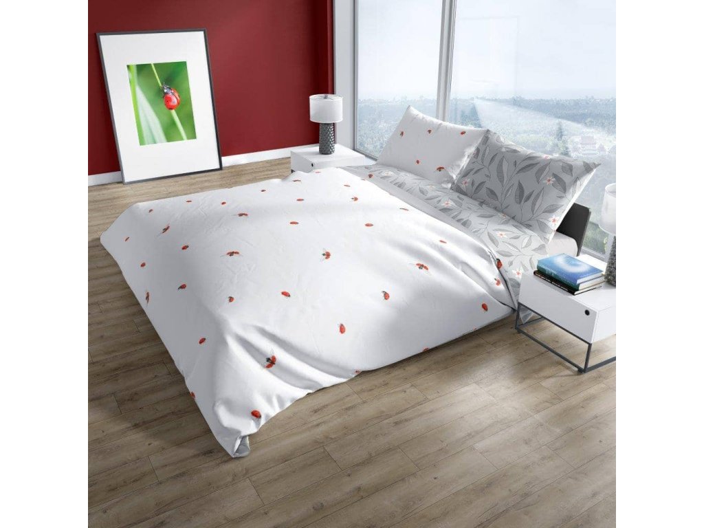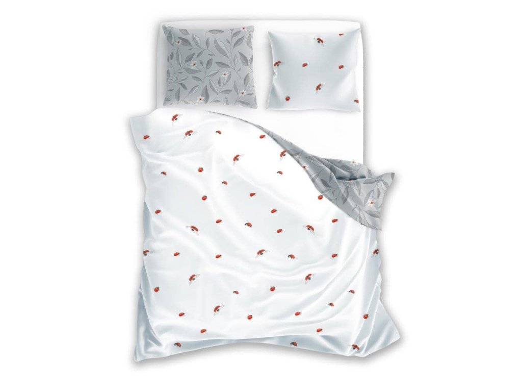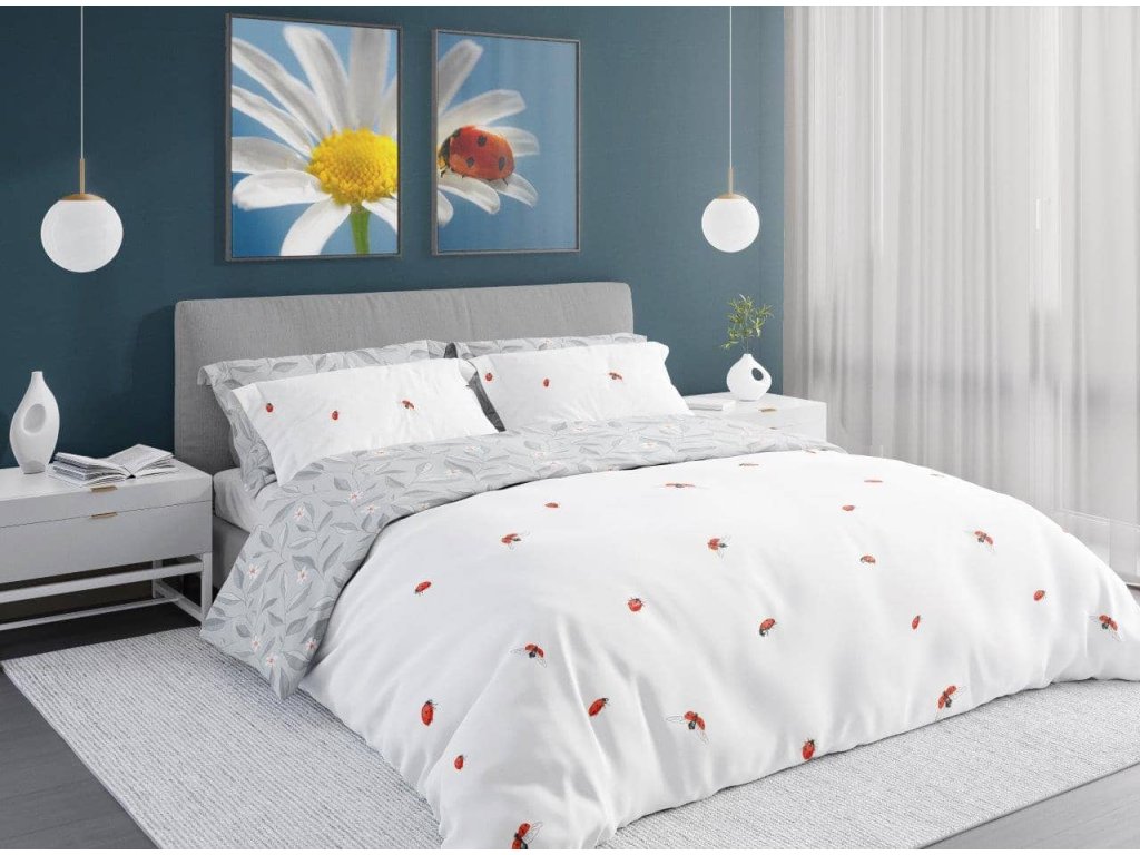 Obojstranné obliečky poskytne variabilitu. Z jednej strany je motív lietajúcich lienok na bielom a na druhej strane motív listov na šedej.