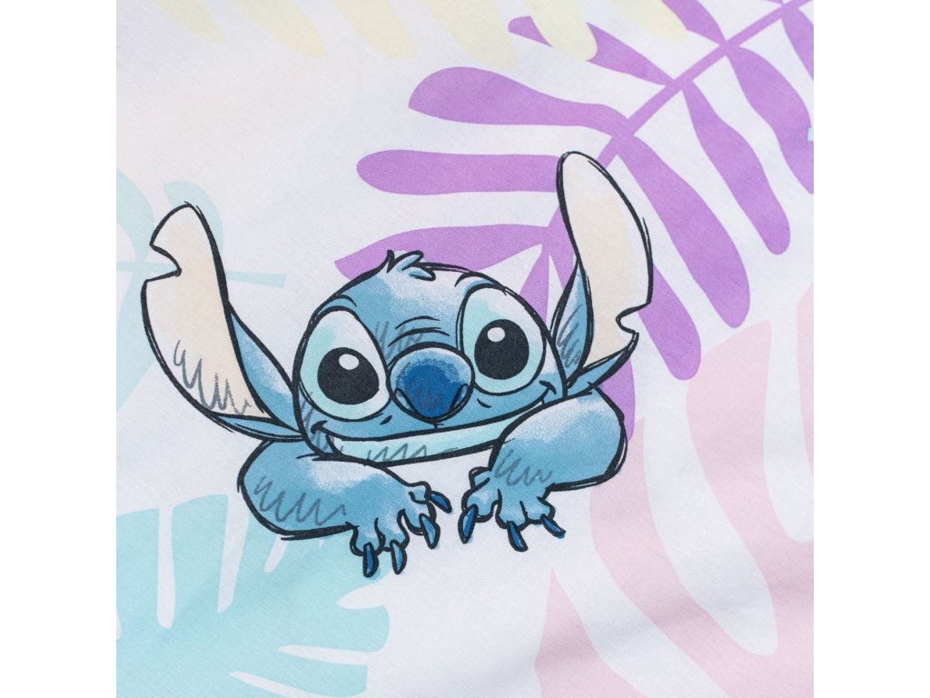 Obliečky majú obojstrannú potlač – každá strana má iný motív, vďaka tomu môžete ľahko meniť vzhľad postele podľa nálady. Na prednej strane obliečky je Stitch, ktorý objíma kamarátku Angel. Zadná strana má motív palmových listov, medzi ktorými vykukujú Lilo a Angel.