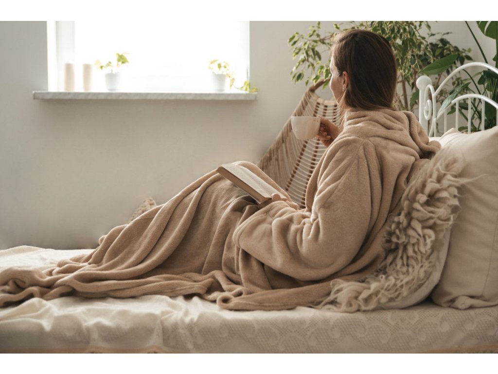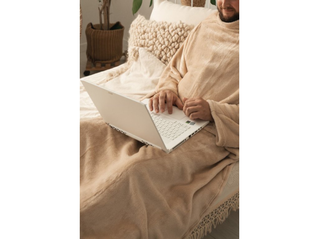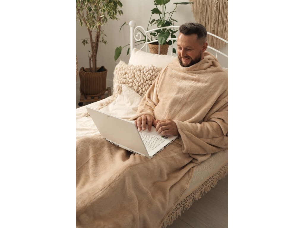Veľmi príjemná hebučká deka z mikroplyšu v béžovej farbe. Veľkou výhodou tejto deky sú rukávy, ktoré sú praktické pri čítaní knihy alebo práci na notebooku. Deka je vyrobená zo 100% polyesteru v rozmere 150x210 cm. Gramáž tejto deky je 320 g/m2. Jej povrch je veľmi jemný a príjemný na dotyk. Ani po niekoľkých praniach nemení farbu a nežmolkuje, je odolná voči pokrčeniu, a stále si udržuje svoj tvar a vzhľad. Mikroplyšový materiál má jemný a zamatový vzhľad s krátkymi vláknami, ktoré vyzerajú ako koralové útesy, odtiaľ pochádza jeho názov. Pokiaľ ide o teplo, plyšové deky zadržujú teplo a tvoria izolačnú vrstvu, čo znamená, že udržujú teplo blízko vášho tela.