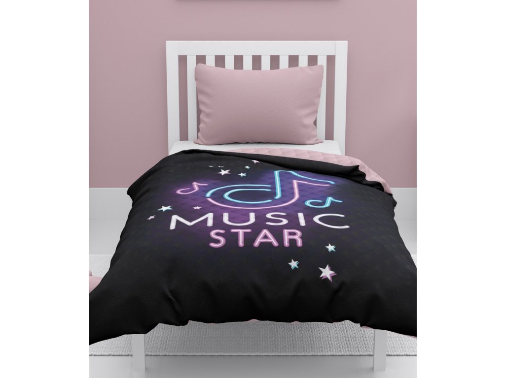 Ani v detskej izbičke by nemal chýbať prehoz na posteľ. S obrázkom nôt a nápisom MUSIC STAR nadchne všetky slečny, ktoré milujú hudbu. Prikrývka má čiernu farbu z prednej strany, zadná strana je ružová. Prikrývka na posteľ je ušitá zo 100% polyesteru má rozmer 170x210 cm. Prikrývka tak dotvára celkový vzhľad izby vášho dievčatka. Prikrývka je vyplnená tenkou vložkou - cca 4 mm a je prešitá tak, aby výplň držala na svojom mieste. Nevyťahuje sa, skvele sa na ňom sedí av lete sa môže použiť aj ako prikrývka. Je obšitý lemovkou po celom obvode. Prikrývka tiež dokonale ochráni perinu a vankúš pred nečistotami. Prikrývka sa ľahko udržuje, odporúčame občasné pranie v práčke na 30°C.