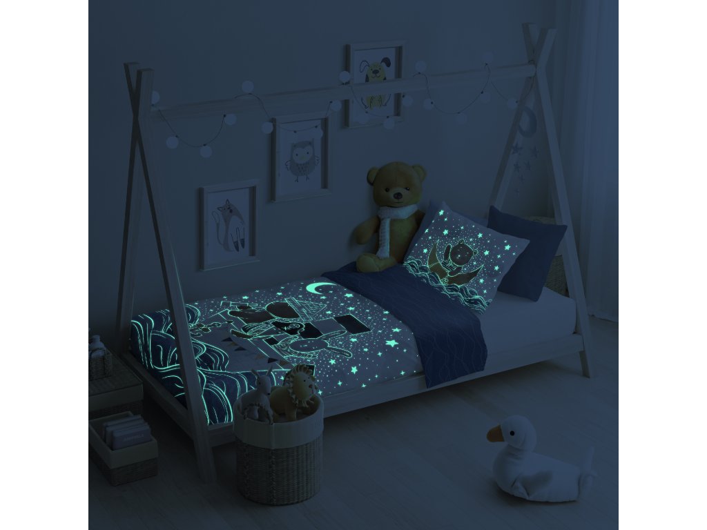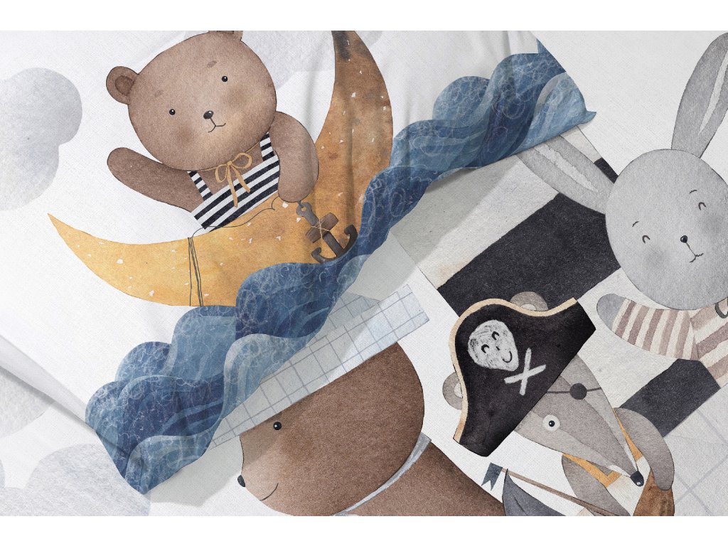 Veselá potlač je z každej strany iná - na lícnej strane je partia kamarátov, ktorí sa chystajú vyplávať v ústrety dobrodružstvu. Na rubovej strane je motív morských vĺn na modrom podklade. Obliečky sú svietiace v tme.