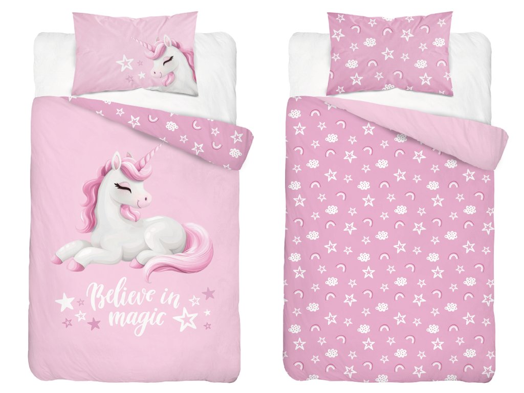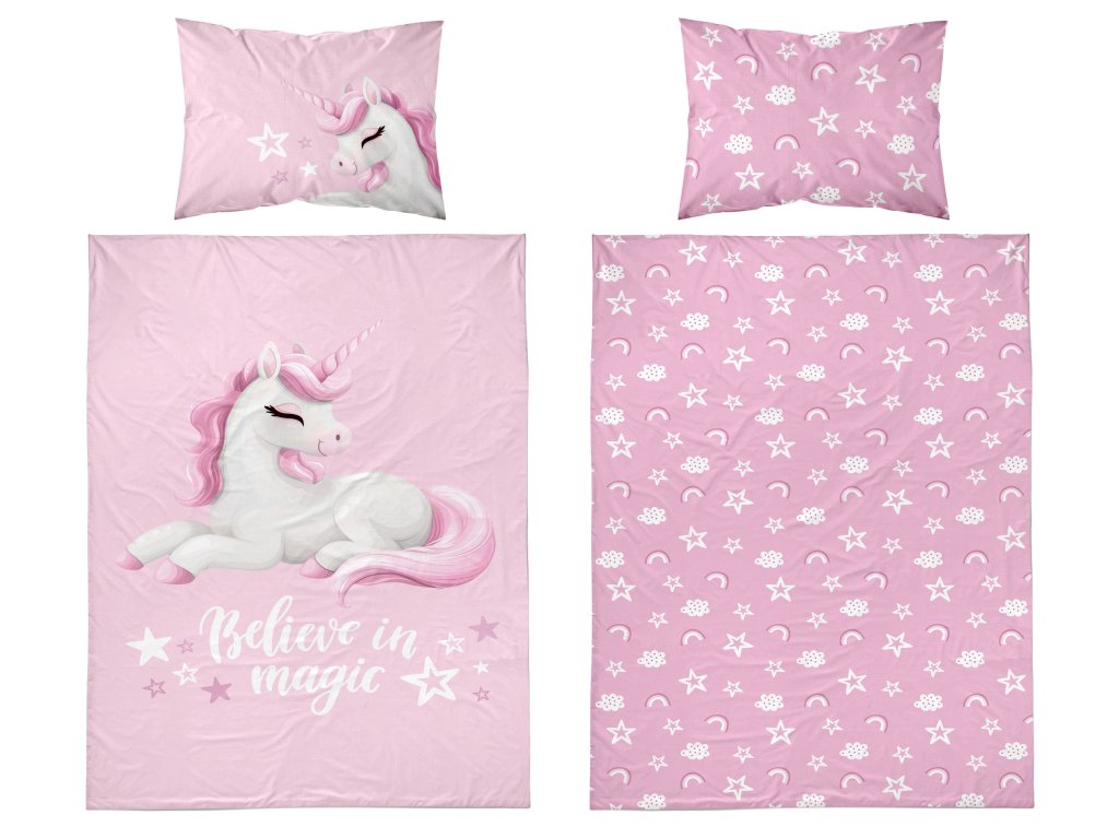 Obliečky majú obojstrannú potlač – každá strana má iný motív, vďaka tomu môžete ľahko meniť vzhľad postele podľa nálady. Na prednej strane obliečky je ružový jednorožec. Zadná strana je ružová s drobným motívom hviezdičiek, dúhy a mráčikov.