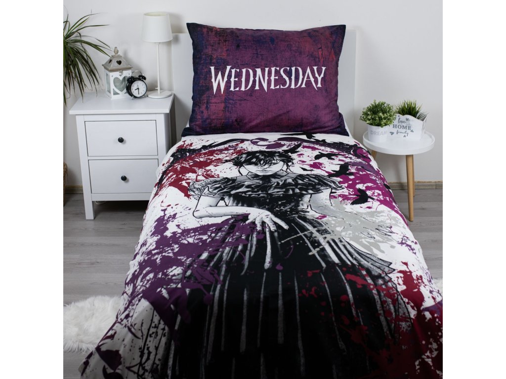 Obliečky majú obojstrannú potlač – každá strana má iný motív, vďaka tomu môžete ľahko meniť vzhľad postele podľa nálady. Na prednej strane obliečky je atraktívny motív Wednesday. Zadná strana je fialová s motívom čiernych havranov.