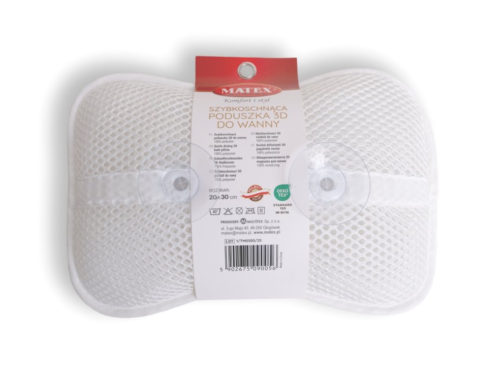 Praktické prísavky zaisťujú stabilné uchytenie na hladkom povrchu, takže vankúšik bezpečne drží na mieste a poskytuje pohodlie presne tam, kde ho potrebujete. Je vyrobený zo 100% polyesteru, ktorý je príjemný na dotyk, rýchlo schne a ľahko sa čistí, takže je po každom kúpeli pripravený na ďalšie použitie. Kompaktný rozmer 20x30 cm padne do väčšiny vaní a dokonale doplní vašu domácu relaxačnú zónu.